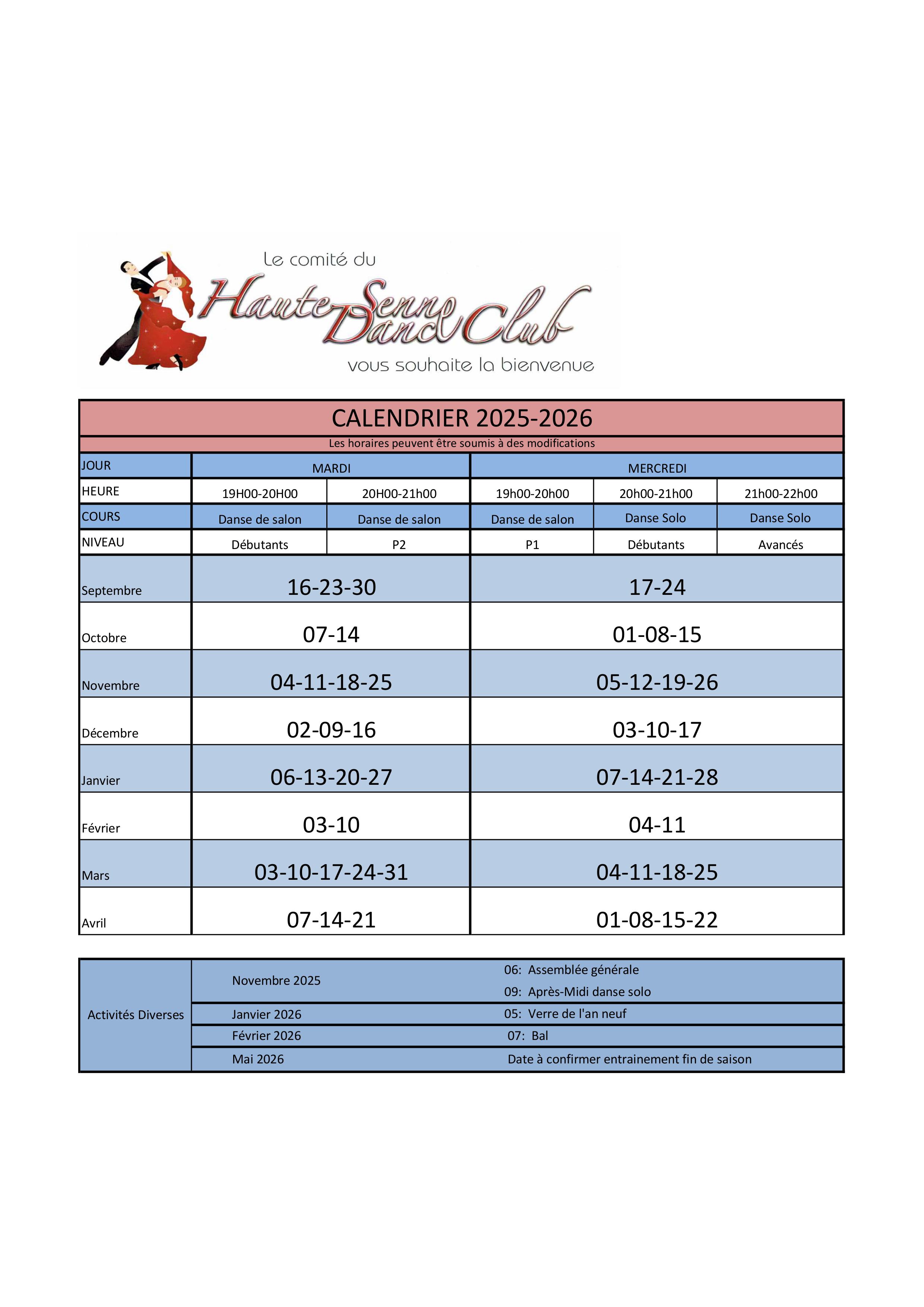 Les niveaux et horaires sont les suivants: